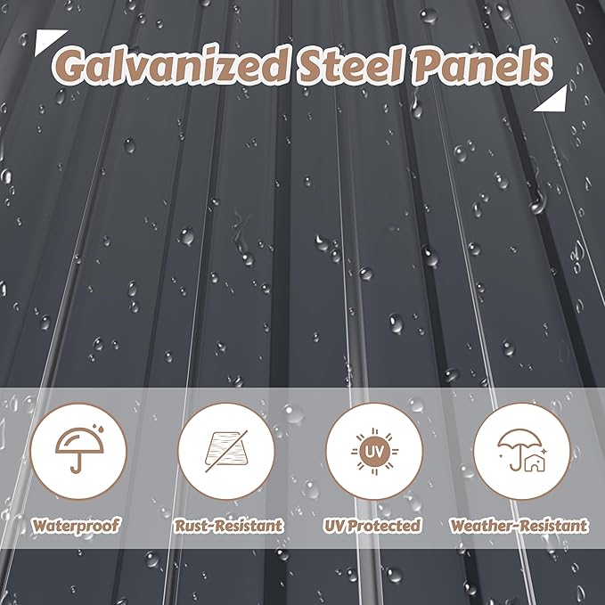 - Galvanized Steel Panels Roof - The outdoor storage shed consists of upgraded and thickened galvanized steel panels, which is not only waterproof, rust-resistant and UV protection, but also sturdy and stable, making it withstand various weather conditions and suitable for long-term outdoor use. Besides, the sloped roof design of the tool house allows rapid drainage to prevent accumulation of rain and snow.