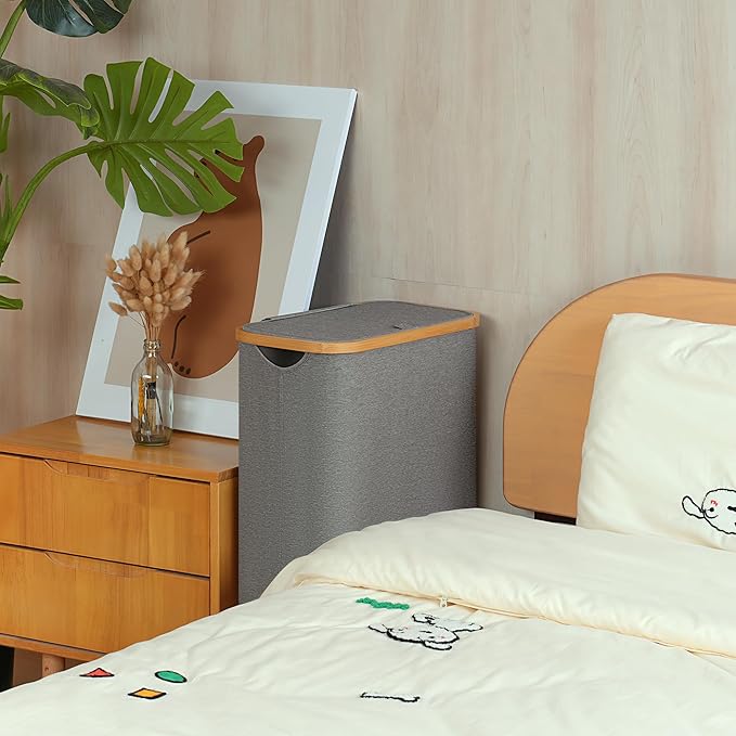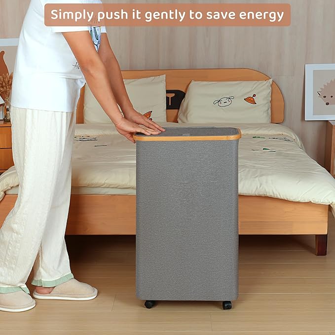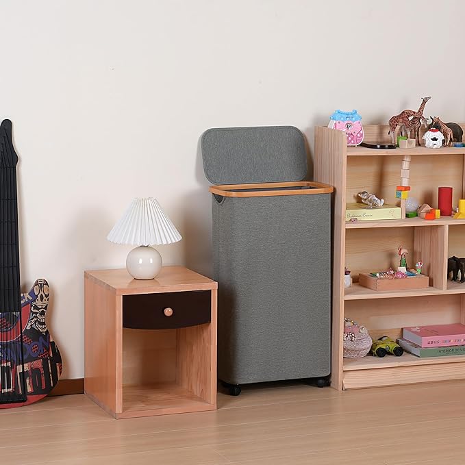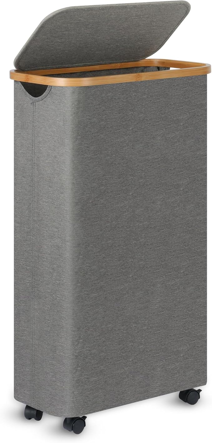 Slim Laundry Basket with Wheels,Narrow Hampers for Laundry, Laundry Hamper with Lid&Bamboo Handles,Collapsible Waterproof Tall Cloth Hamper for Dorm Family(60L Grey)