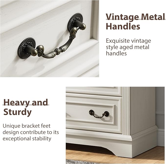 - 【Spacious and Stylish】This beautifully designed dresser offers ample storage space with 4 large drawers and 3 generously sized drawers, perfect for organizing your clothes, linens, and other essentials in any room. Its metal drawer pulls feature an antique brass hue to complete the vintage, French country look.