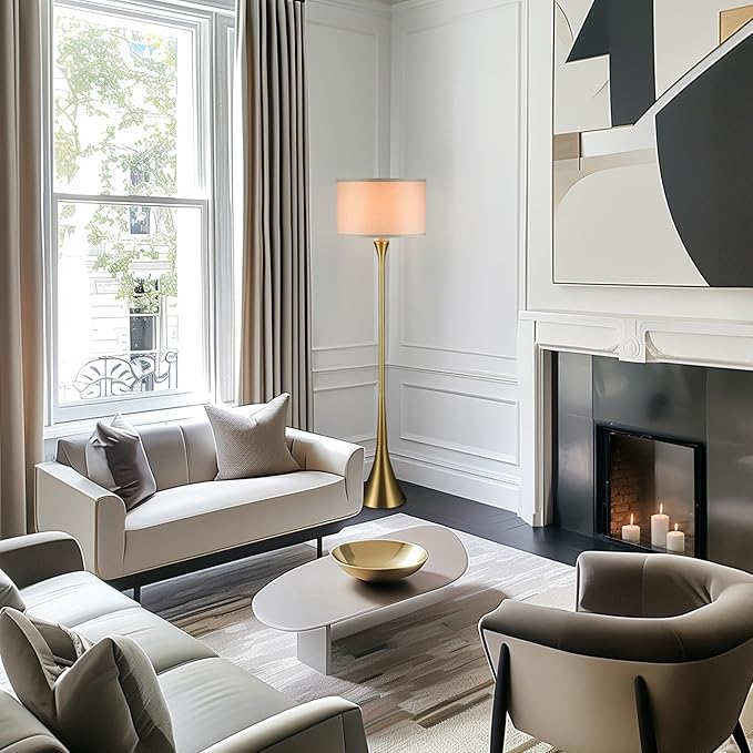 GLOBE Electric 61000150 60" Floor Lamp, Antique Brass Finish, Beige Fabric Shade, Mid-Century Modern Standing Lamp, E26 Base, Sustainable Design for Living Rooms and Bedrooms