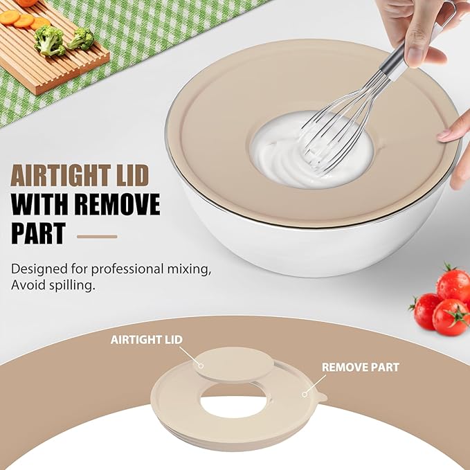 7-Piece Stainless Steel Mixing Bowls Set with Lids & 3 Grater Attachments – Size 4.5, 4, 3.5, 2.1, 1.5, 1.1, 0.7QT, Kitchen Gadgets Set for Cooking, Baking, and Serving, Khaki