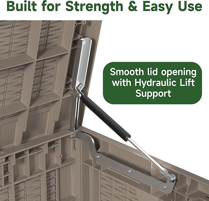 - ENHANCED SAFETY FEATURES - The EasyUp storage box features a hydraulic rod that allows for smooth lid opening and closing, reducing the risk of accidental pinching. The built-in locking mechanism adds an extra layer of security, making it ideal for safeguarding outdoor valuables.