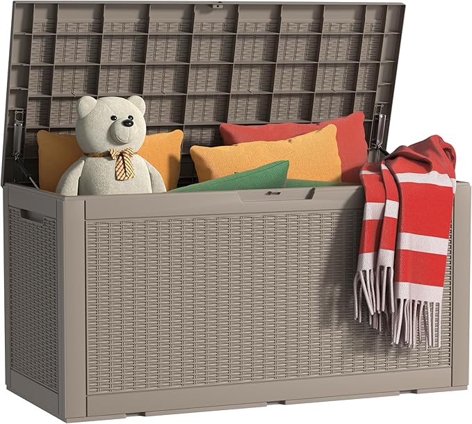 - WATERPROOF AND FADE PROOF - Crafted from high-quality, eco-friendly resin, this deck box is designed to be waterproof and UV-resistant, ensuring excellent durability. With UV resistance tested for over 1000 hours, it withstands harsh sun and rain, keeping your belongings safe in any season.