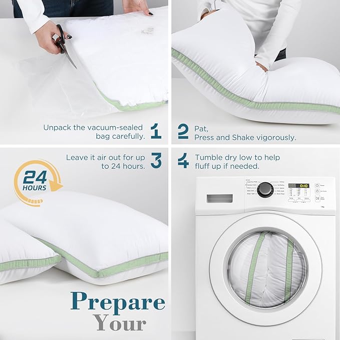 - Hassle-free Use: Made of machine-washable and dryer-friendly materials, this pillow set is easy to maintain and will bloom like new even with repeated cleaning. Comes vacuum-sealed and expands quickly to its full size within 24 hours