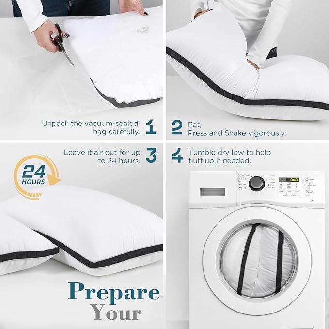- Hassle-free Use: Made of machine-washable and dryer-friendly materials, this pillow set is easy to maintain and will bloom like new even with repeated cleaning. Comes vacuum-sealed and expands quickly to its full size within 24 hours