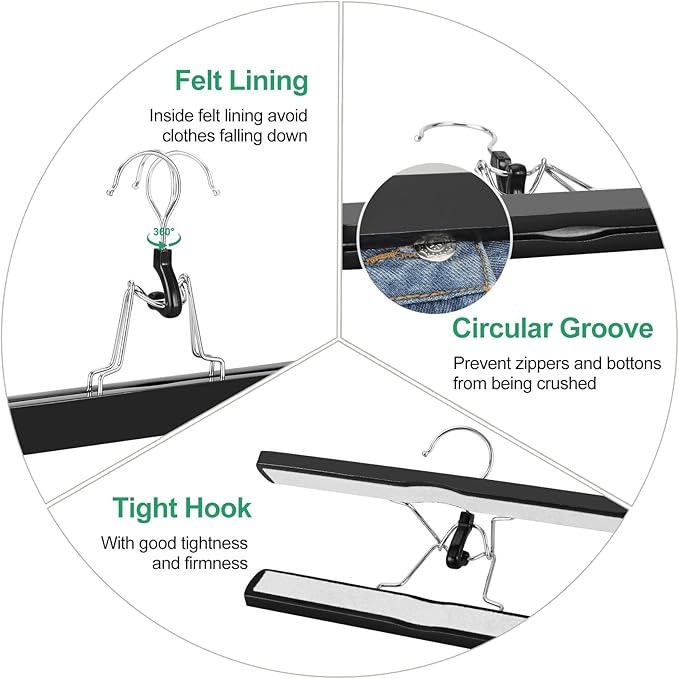 - Multiple Use: These wooden hangers have 2 flat wood bar which can clamp well with the slacks, pants, skirts, jeans, shorts, trousers, leggings, hair extension, etc