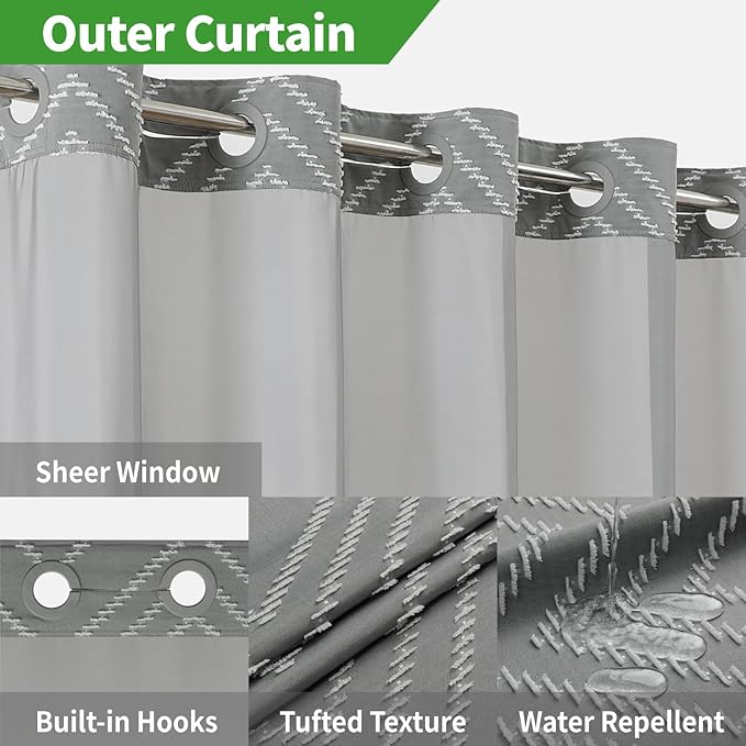 - 【Shower Curtain with Snap-On Liner】:This snap-on fabric shower curtain liner is easily detachable, making it convenient for cleaning or replacement.Equipped with 2 magnets at the bottom corners for added stability and to prevent splashing