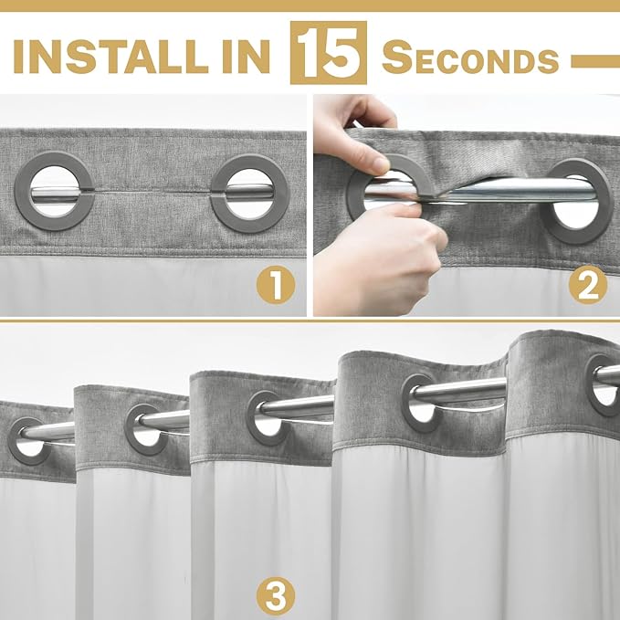 - 【No Hook Shower Curtain Set】No hooks needed design with built-in rings for easy on and off. The replaceable snap-on/off liner is easy to put up and take down and convenient to clean and replace