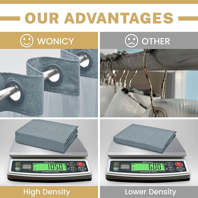 - 【Linen-look Fabric】The shower curtains are made of faux linen, which is wrinkle-resistant and non-fading. The texture of the shower curtain is high-end and the colors are vibrant making it an easy match for many bathrooms or bathtubs