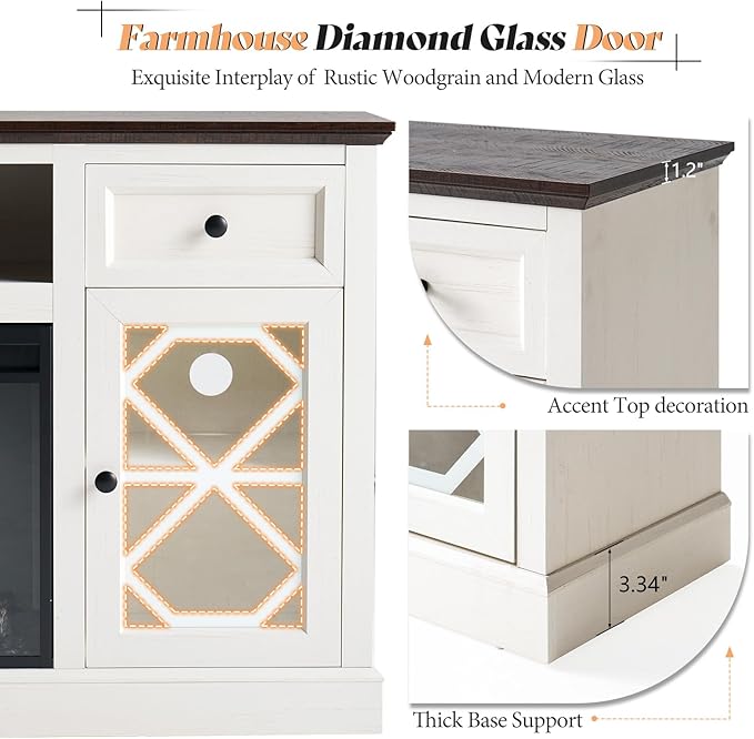 AMERLIFE Farmhouse Fireplace TV Stand with 37" Electric Fireplace for 80 Inch TVs, Large LED Media Entertainment Center with Drawers, 31" Tall Highboy TV Console Cabinet with Door, Living Room, White
