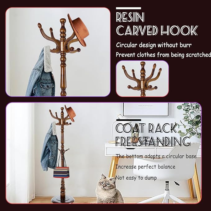 - Sturdy and Stable:The wooden coat rack is carefully selected from natural birch wood. ensures stability. exquisite resin hooks with smooth lines, hard and unbreakable. coat stands for entryway smooth and free of burrs, and it can be hung without damaging clothes