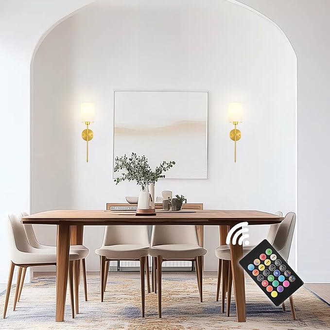 - SCONCES WITH REMOTE CONTROL: The battery operated wall light comes with a remote control, offering a range of features such as adjustable brightness (10-100%), customizable color temperatures (1800K-amber light/3000K-warm white/4000K-neutral white/6000K-daylight), 9 RGB color options with flash and fade mode, timer settings (30/60/120 minutes), and a convenient one-touch night light function