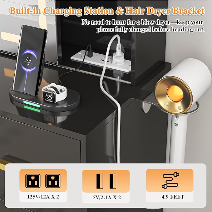 - 【Convenient Charging Station】The makeup desk is equipped with 2 USB ports and 2 AC power outlets, eliminating the need for extra power strips and preventing cable clutter. You can easily charge your phone while doing your makeup or working, ensuring you never leave home with a low battery. The fixed hairdryer holder also makes it convenient to find your hairdryer when you need it, saving you time and hassle
