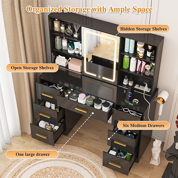- 【Storage Expert】This vanity desk features seven drawers and six open shelves, allowing you to organize items based on frequency of use. Frequently used items can be placed on the tabletop, shelves, or top drawers for easy access, while less frequently used items can be stored in the lower drawers, minimizing the hassle of searching. This way, you can effortlessly keep your desktop, bedroom, or dressing room neat and orderly