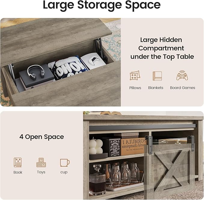 - 【Spacious Storage】This coffee table features a hidden storage compartment under the lift top, keeping all your living room essentials close at hand while keeping clutter at bay. The coffee table's 4 open compartments each feature removable, adjustable shelves (3 height adjustable), allowing you to customize your storage space.