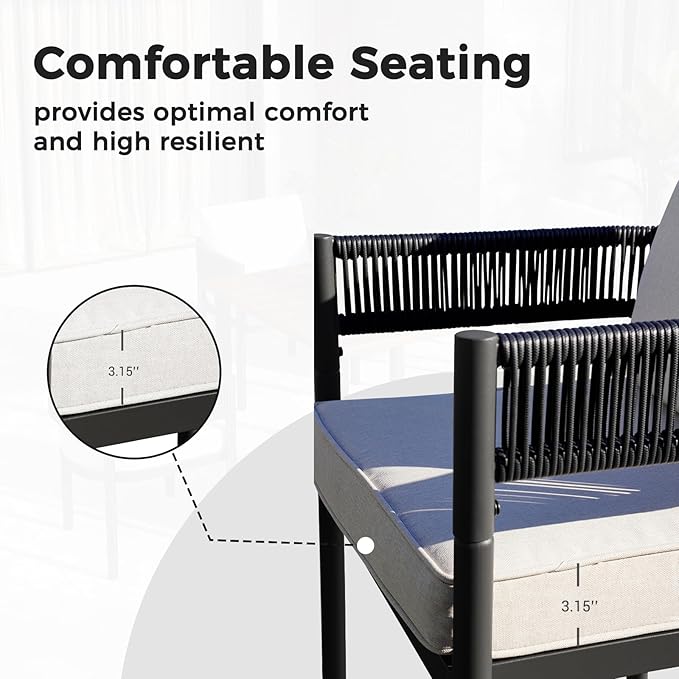 - MODERN COMFORT: Have a unique outdoor dining scene with this patio dining set that features rounded soft curves and modern lines. The two-toned palette features neutral-toned cushions that highlight a contrasting modern steel frame in quiet sophistication