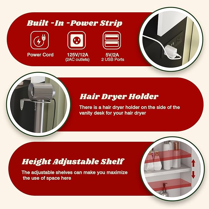- 😘【Built-in charging station and hairdryer stand】This multi-functional dressing table includes 2 standard sockets, 2 USB ports and a handy hairdryer holder so you can easily access your hairdryer, mobile phone and curling iron while getting ready. Combining style and practicality, this charming make-up table is perfect for use in dressing rooms, bedrooms, salons or live broadcasts.
