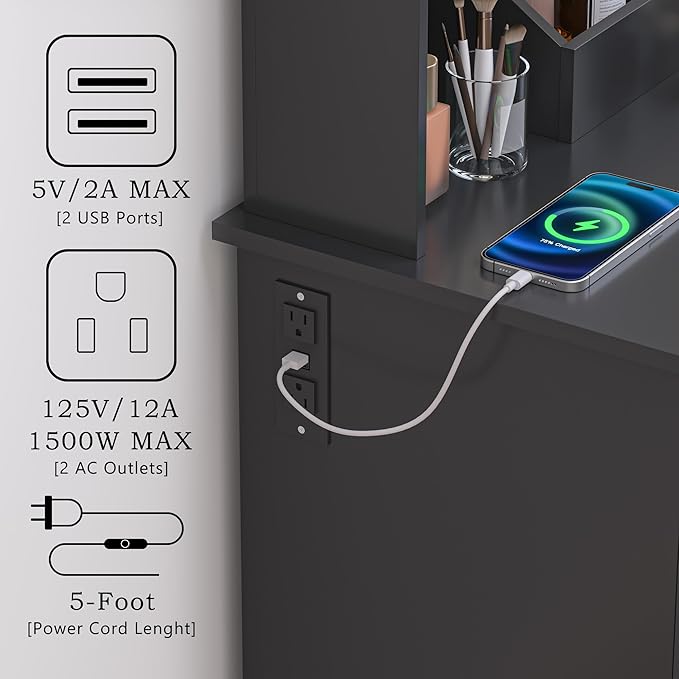 - Convenient Charging Station – Stay connected and powered up with this vanity desk with mirror and lights, featuring a built-in power outlet, 2 USB ports, and 2 AC outlets. Whether charging your phone, tablet, or powering your hair dryer and curling iron, this makeup vanity desk ensures all your electronic devices are at hand while you prepare for the day or night.