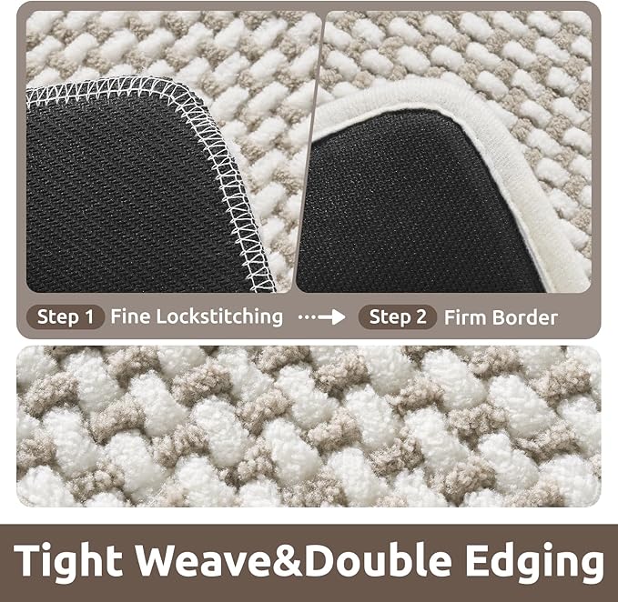 - [Update Double Edge & Color] Tightly woven bathroom runner with double locking edge process makes bathroom runner rug more stable, not easily dispersed, more robust than most of others chenile bathroom rugs. Stylish two-color design versatile, light and cozy chenille bathmat makes your feet feel cozy and relaxed.