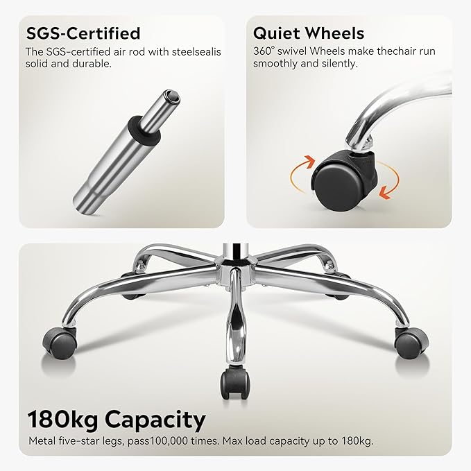- High-Quality Construction for Durability and Stability: Constructed with a sturdy iron base and durable casters, the chair supports up to 300 lbs. The BIFMA-tested casters provide smooth mobility across various surfaces, while the robust base ensures stability and long-term use, making it a reliable choice for both home and office settings.