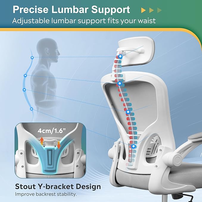 DEVAISE Office Chair, High Back Mesh Ergonomic Desk Chair with Flip-up Armrests, Adjustable Headrest and Lumbar Support, White