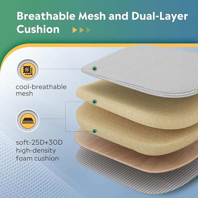 - Breathable Mesh and Dual-Layer Cushion for Extended Comfort: The back and seat feature breathable mesh, providing excellent airflow to prevent heat buildup from prolonged sitting. The dual-layer high-density foam cushion (25D + 30D) combines softness with robust support, effectively reducing hip pressure and offering lasting comfort—perfect for both work and gaming sessions.
