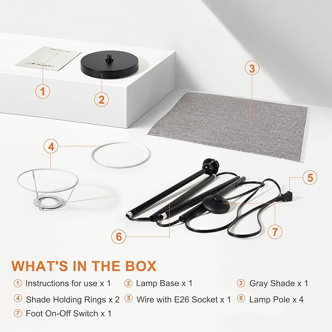 - The floor lamp itself is pretty basic with a foot switch(turn On/OFF), an E26 bulb socket and a Beige Lampshade & black Lamp Pole.