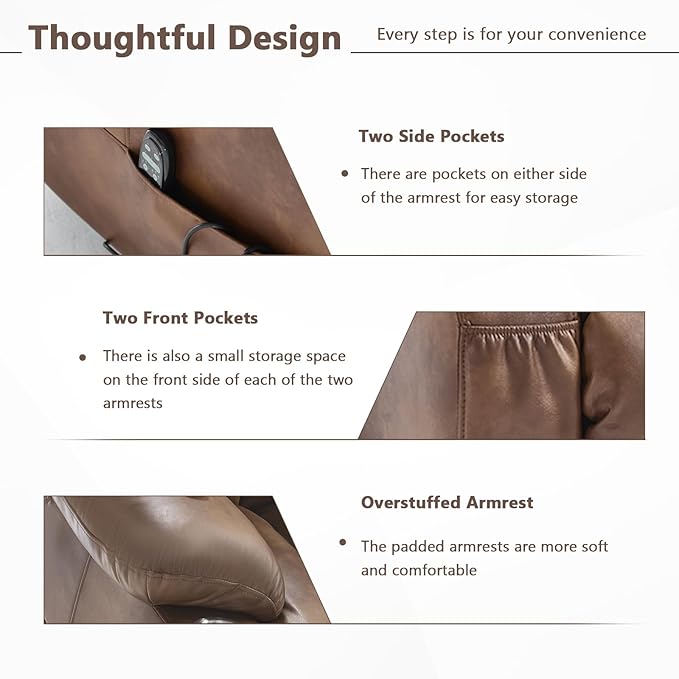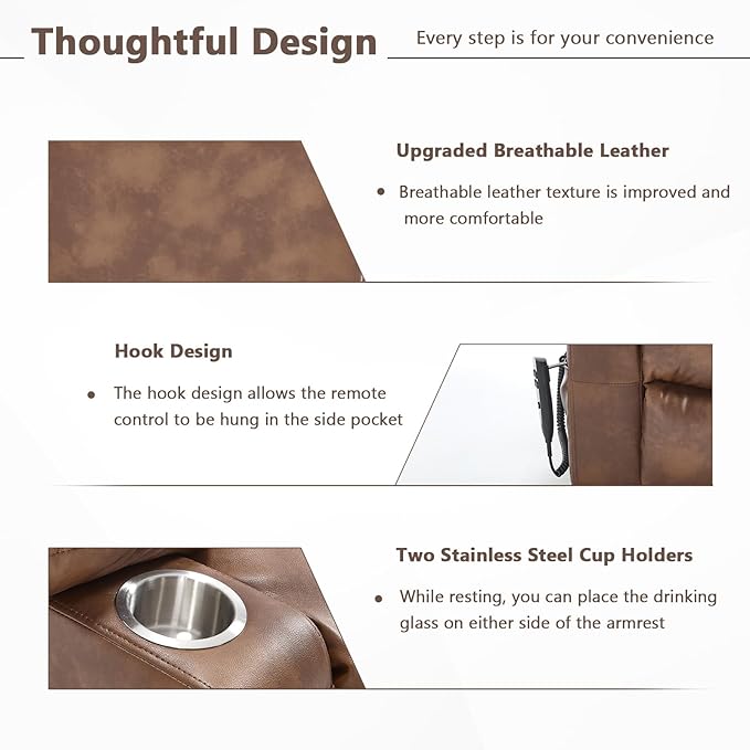 - More Than You Want: This heated massage recliner is made of breathable leather, which is durable and scratch resistant.Two stainless steel cup holders are provided for your drink. Pockets on both sides of the dual motor recliner chair for elderly allow for small items within reach.
