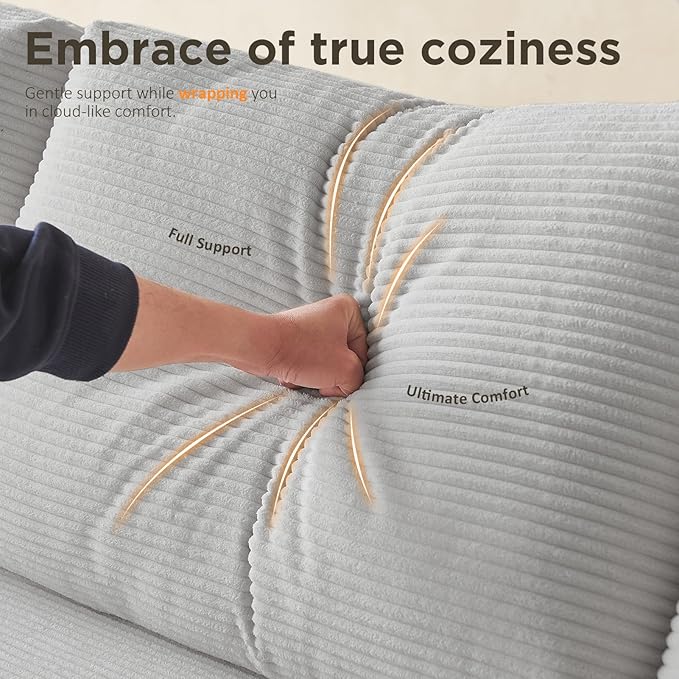 - Plush Corduroy Cloud Couch-Sink into ingeroom corduroy couch featuring velvety-soft ridges that pamper skin year-round. The durable 100% polyester fabric resists pilling and pet claws. Reinforced loveseat cushions with high-density foam mimic a cloud sofa's embrace – supportive for movie nights yet soft enough for afternoon naps.