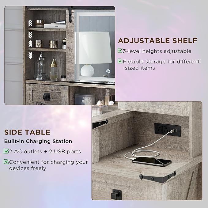 - CHIC FARMHOUSE VANITY DESK: Overall Measuring: 48''W * 15.67''D*54''H.The Glam glass visible tabletop seamlessly blends the farmhouse theme and adds sophistication to the space. Distressed weathered finish in a replicated wood grain with authentic touch—the warm wood tones and barn door elements go together to lend a chic rustic flair. Sliding HD mirror brings a classic touch and an upholstered stool adds refinement. This T4TREAM makeup vanity set is your dream bedroom retreat realized