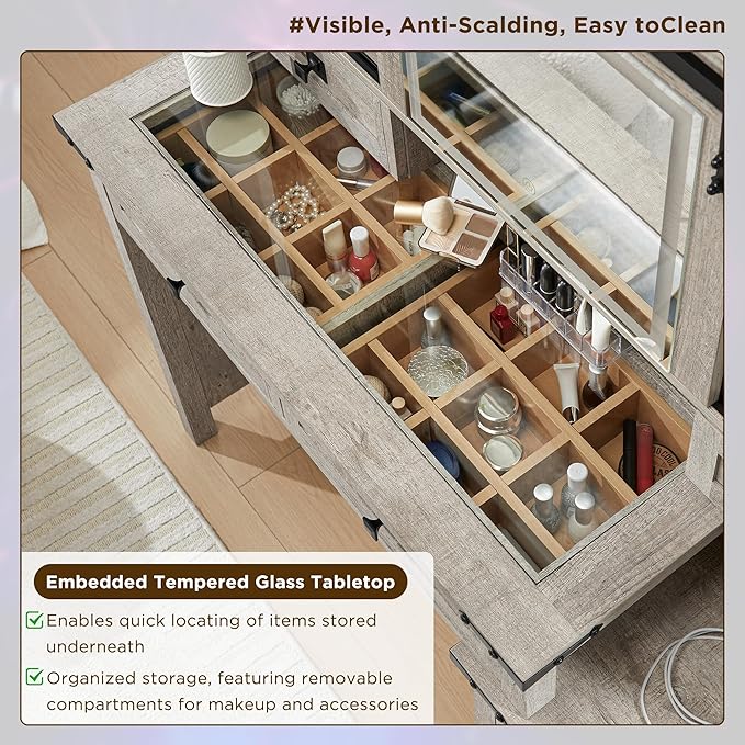 - BUILT FOR LAST: This desk is made from FSC-Certified wood, no strong odor, anti-scratching and scalding tempered glass, and anti-rust iron-tone metal. the thickened 1'' tabletop with a max load of 50 lbs. The vanity desk is built to withstand daily use and provide long-lasting storage. Designed with the customer in mind, this table combines functionality and aesthetics.