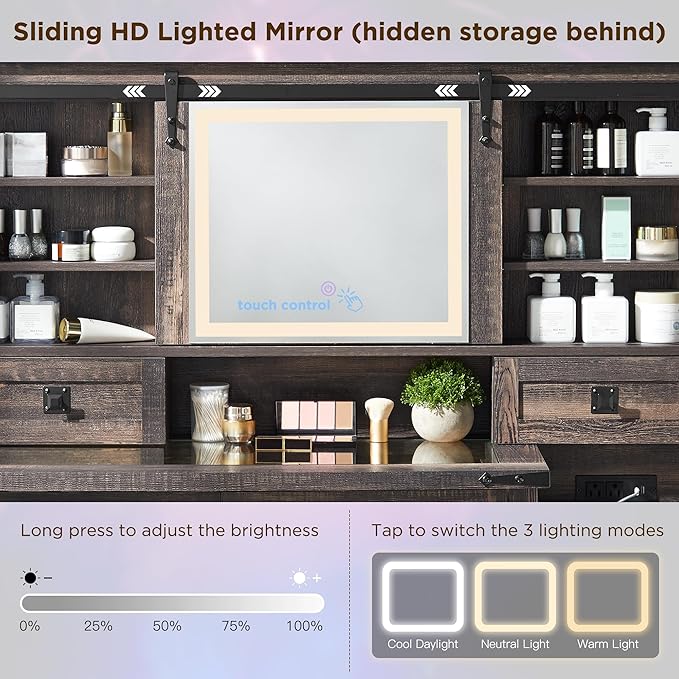 - SLIDING TOUCH CONTROL LIGHTED MIRROR: You can slide the mirror to either side you like freely. Operate the mirror with utmost ease through its intuitive touch control feature. Gently touch the button of the mirror to adjust the 3 color modes included. Long press to adjust the brightness under each light mode, providing you with the perfect ambiance for your makeup application, hair styling routine, or daily skin care. This user-friendly making your daily beauty rituals effortless and enjoyable.