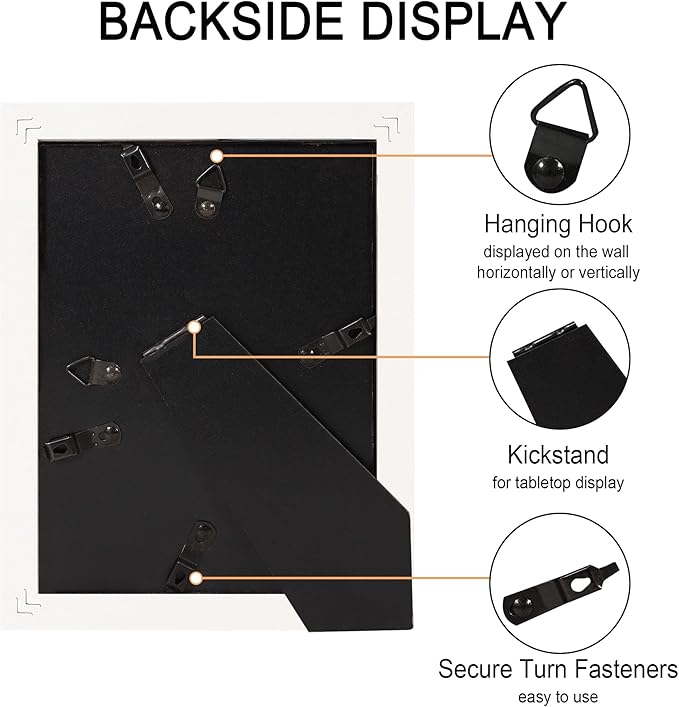 - Easy to use: The 5x7 frame features flexible rotating labels, and the spring-loaded action on the back removes the back panel without hurting your fingers. additionally, we offer accessories for easy hanging and flexible display of your photos