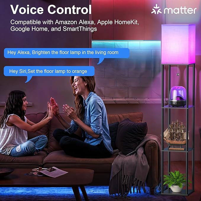 Floor Lamp with Shelves for Living Room with Matter Smart LED Light Bulb Works with Google Home/Alexa/Apple Home/SmartThings/Siri, Modern Standing Lamp Color Changing Corner Light Bedroom Home Decor