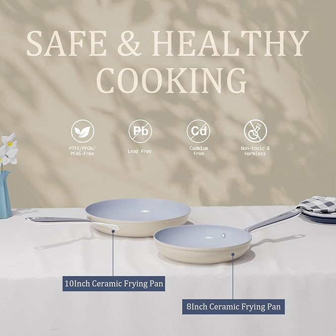 - ๐ญ๐ฌ๐ฌ% ๐๐จ ๐๐๐ซ๐ฆ๐๐ฎ๐ฅ ๐๐ก๐๐ฆ๐ข๐๐๐ฅ๐ฌ & ๐ก๐ผ ๐ฃ๐๐๐ฆ/๐ฃ๐ง๐๐/๐ฃ๐๐ข๐ - Superior to Teflon Pans: Crafted with 3X Durable Ceramic Coating, our 10-inch nonstick frying pan is 100% free from PFAS, PTFE, PFOA, lead, and cadmium. Healthier cooking with 50% less oil โ perfect for eggs, pancakes, or grilled cheese. Proven Safety: 800+ lab tests ensure zero chemical release even at 500ยฐF.