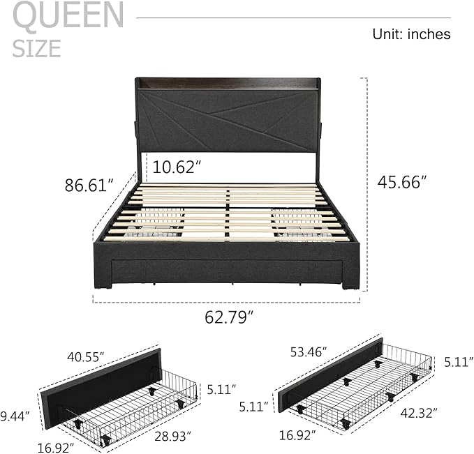 - Say goodbye to clutter with our ingeniously designed queen size bed frame with drawers, featuring 3 large drawers on smooth wheels. These spacious metal frame drawers, covered in durable flax fabric, provide ample storage for bedding, clothes, and more, helping you maintain a tidy and organized bedroom.