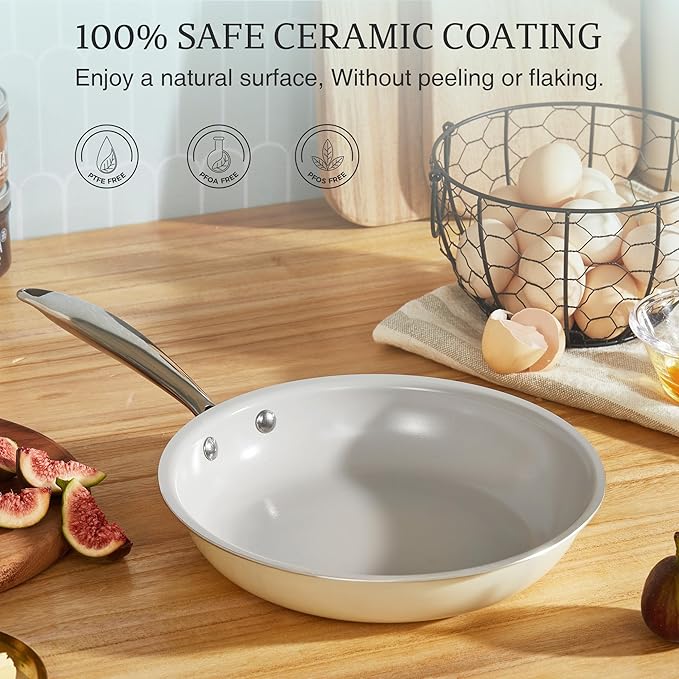 - Cook With Healthy Confidence: No Teflon, no worries, no sticking! These pans feature a premium titanium ceramic coating that ensures the nonstick performance that your food can slides right off the surface with ease. Completely free of PFOA, PFOS, PTFE, and other harmful things, our skillet is as safe as they are effective. Enjoy healthier meals with less oil and more peace of mind, knowing your cookware is as safe as it is durable.