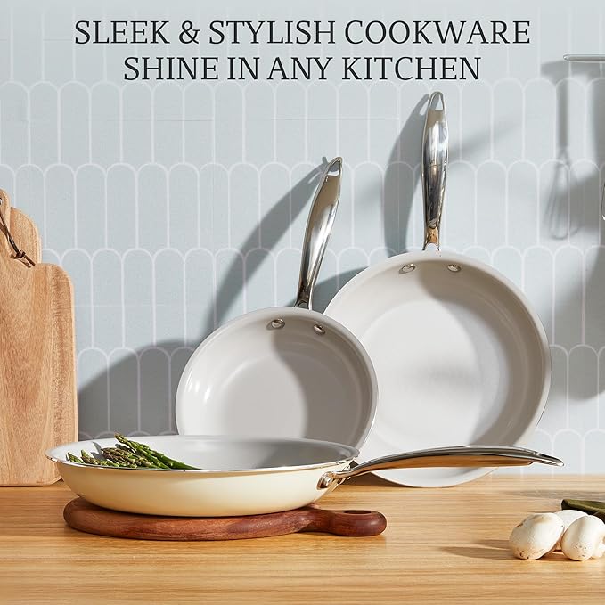 - Designed for Superior Cooking Results: Engineered for even heat distribution, these nonstick skillets heat up quickly and cook your food to perfection every time. The stainless steel, heat-resistant handles are ergonomically designed for comfort and safety, giving you full control even during high-heat cooking. Beauty meets functionality, making the ceramic pan set a joy to use.