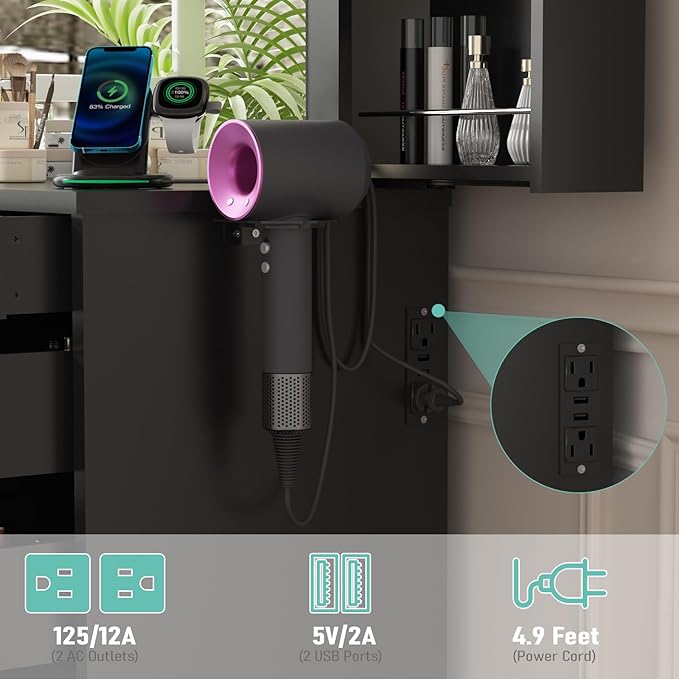 - 【Vanity Desk with Charging Station】This modern vanity includes a charging station with 2 power outlets and 2 USB ports. You can easily plug in your hair dryer or curling iron, and keep your phone or tablet charged while you get ready or watch your favorite shows.