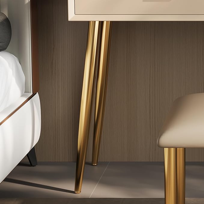 - 【Premium Materials & Sturdy Construction】We use a combination of solid wood frame structure and MDF, and the table legs are made of stainless steel gold-plated parts to ensure the stability and long-term use of this makeup vanity desk. The square stool is wrapped in high-elastic sponge and soft PU, so you won't feel tired even if you sit for a long time.