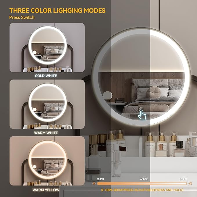 - Adjustable Mirror: This narrow girls vanity set comes with a charming black mirror with LED light, which provides 3 color modes: warm yellow, natural light, and bright white. Long press the touch switch to adjust the light brightness of each mode, it can meet your different needs and is perfect for home, salon, or live broadcast