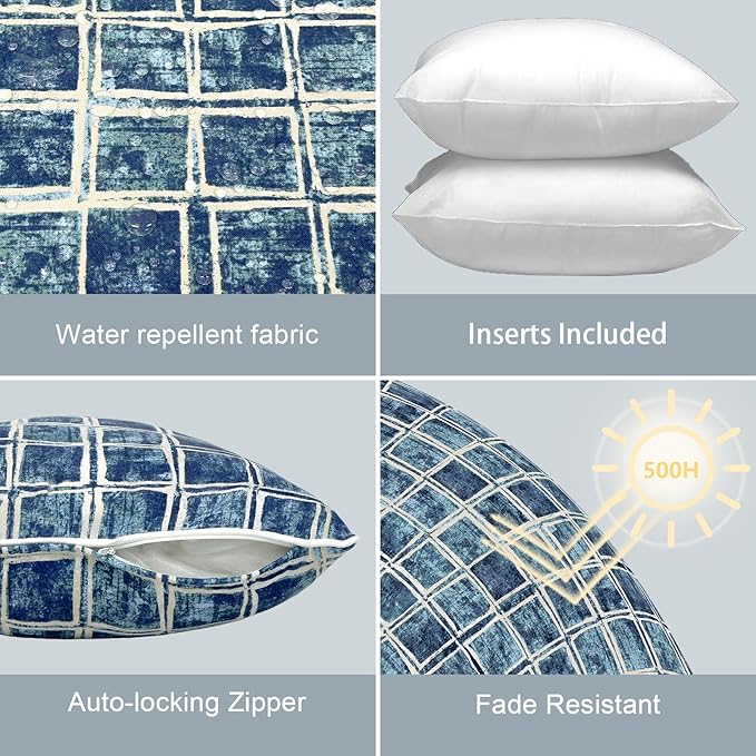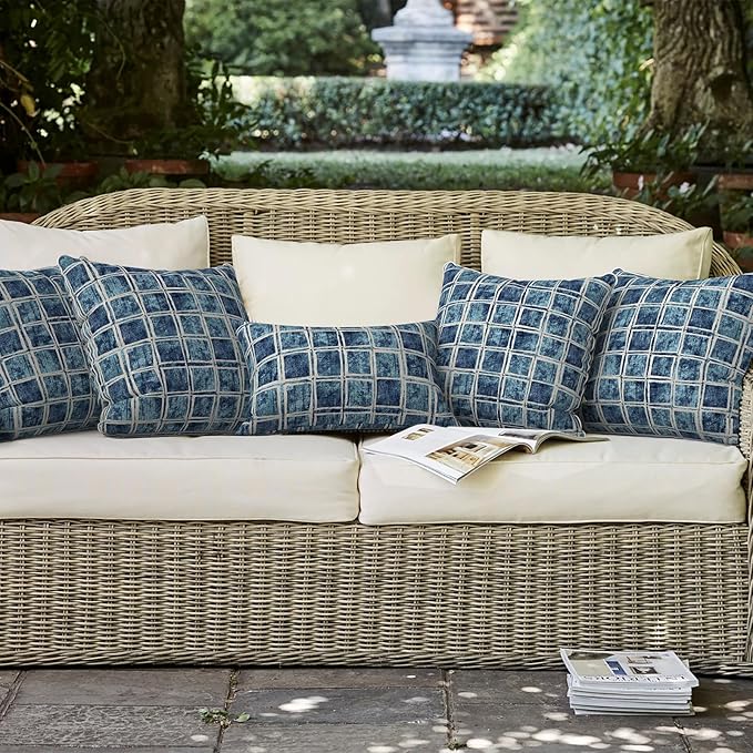 LVTXIII Outdoor Throw Pillows Set of 2, Patio Waterproof Pillows Fade Resistant Accent Pillows for Home and Garden Furniture Decoration, 16x16 Inch, Denim Blue Checkered