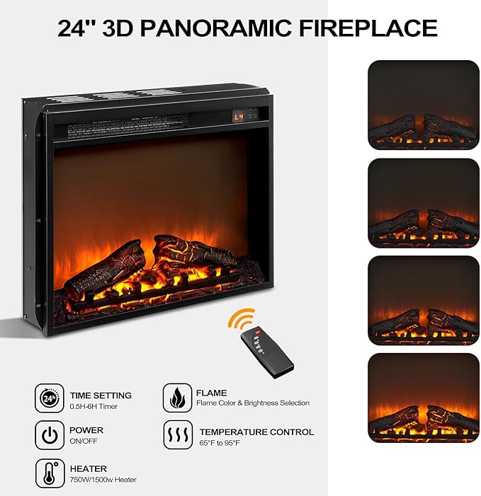 - 23-inch Electric Fireplace with Remote Control: The fireplace TV stand with realistic flame effects and realistic logs creates a clean and comfortable space for you to relax. The electric fireplace TV stand can run for 4 seasons with or without heating, you can freely control the power switch and easily adjust the flame brightness, temperature, timer and more
