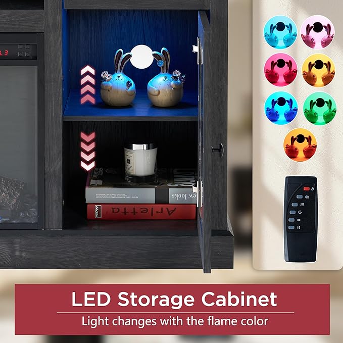 - 【LED Light & Glass Door】LED fireplace TV stand features light strips and glass doors, creating a cozy atmosphere. Light offers 7 adjustable colors, which can sync with the fireplace flame