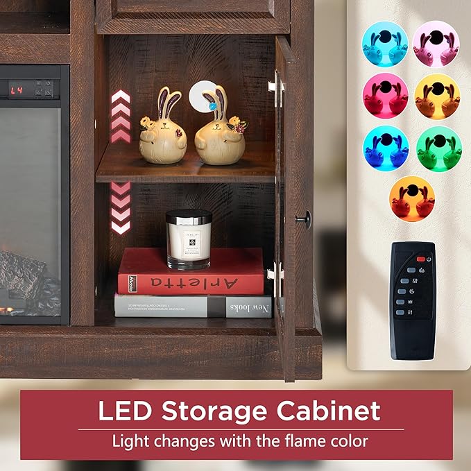 - 【LED Light & Glass Door】TV cabinet features LED light strips and glass doors, creating a cozy atmosphere. Light offers 7 adjustable colors, which can sync with the fireplace flame.