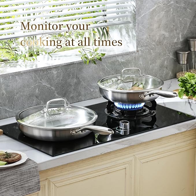 - 【Compatible With All Cooktops】Works on all cook stove tops, include induction, gas, electric, halogen, glass, and ceramic. The high quality stainless steels and the aluminum core make it dishwasher-safe . We recommend proper seasoning and maintenance of the pan according to the instructions.