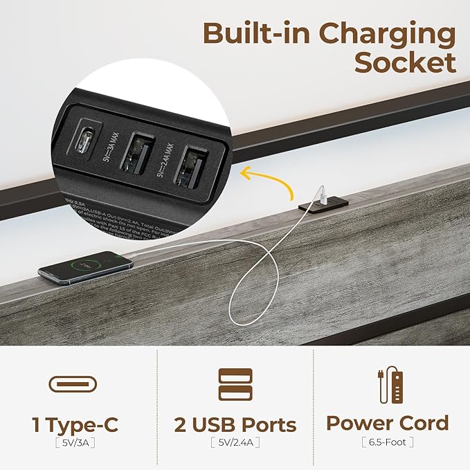 - Bed Frame with Charging Station: Say goodbye to low battery anxiety! This bed frame headboard features a built-in power panel with 2 USB ports and 1 Type-C port, which can totally charge your electronic devices at the same time