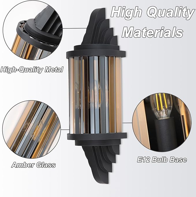 - 【High-Quality Materials】The base and top of the light are adorned with geometric , stepped detailing in a matte black finish, which adds an architectural touch to its appearance. The warm, amber-toned glass panels give the light a soft, inviting glow, making it ideal for creating a cozy, ambient atmosphere in any space. This wall light would work well in both contemporary and retro-themed interiors.