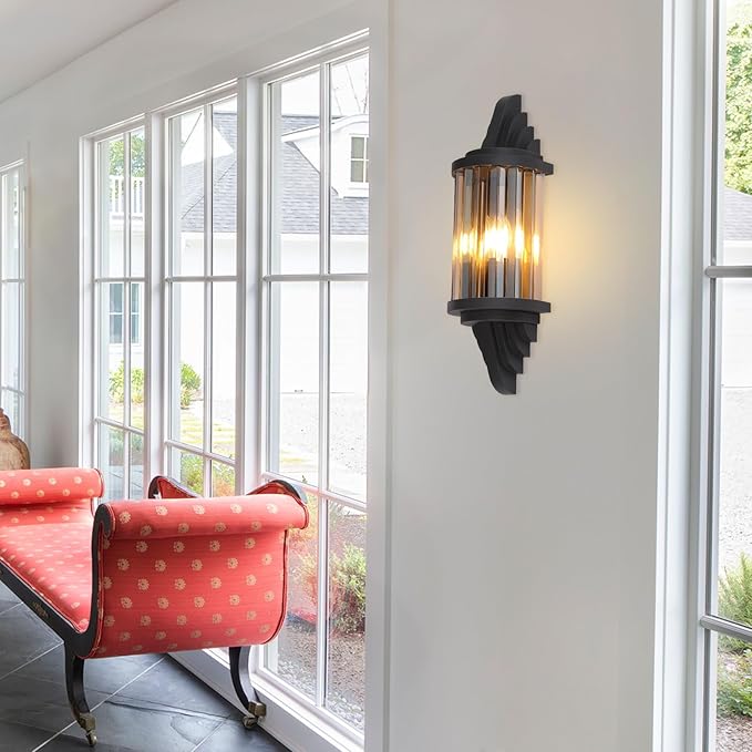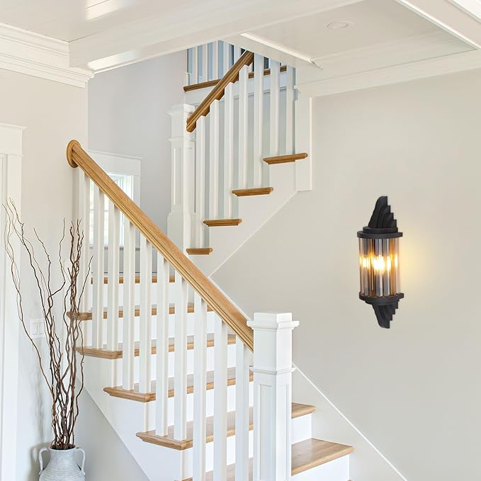 - 【Rustic Style】Rustic wall sconce features a stylish, vintage-inspired design, blending modern and art deco elements. The black wall light has a sleek cylindrical shape with vertical glass panels that create a stunning visual effect when illuminated.