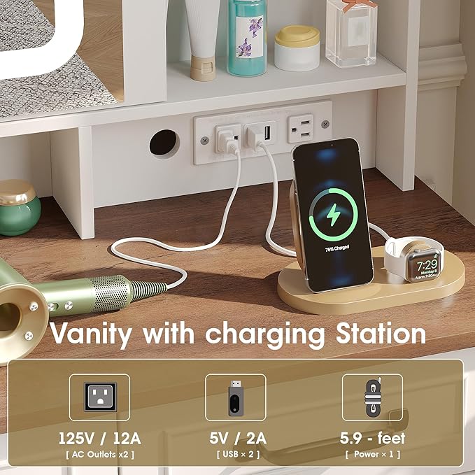 - CONVENIENT CHARGING STATION: The farmhouse vanity with charging station is equipped with 2 USB ports and 2 AC outlets, which can be used to connect beauty equipment or hair dryers, curling irons. It can also charge mobile phones or other electronic devices. Even on busy mornings, you won't have to worry about charging issues